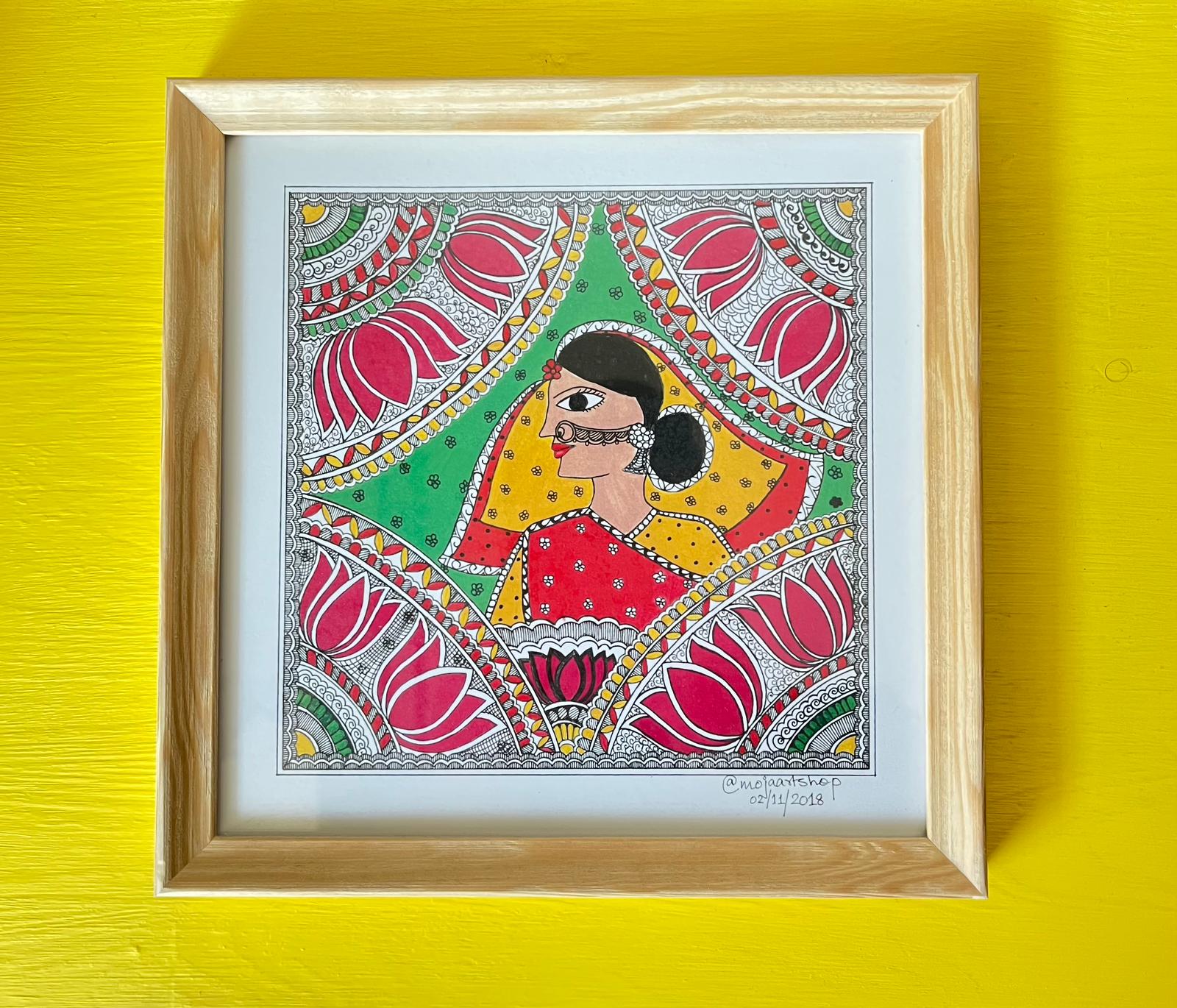This painting portrays a bride adorned in jewelry. It reflects the journey of a girl stepping into a new home, capturing the emotions of farewell, hope, and new beginnings. Inspired by the Mithili style of painting, rendered in bold lines and vibrant colours, this painting celebrates femininity, cultural heritage, and the sacred beauty of marriage.