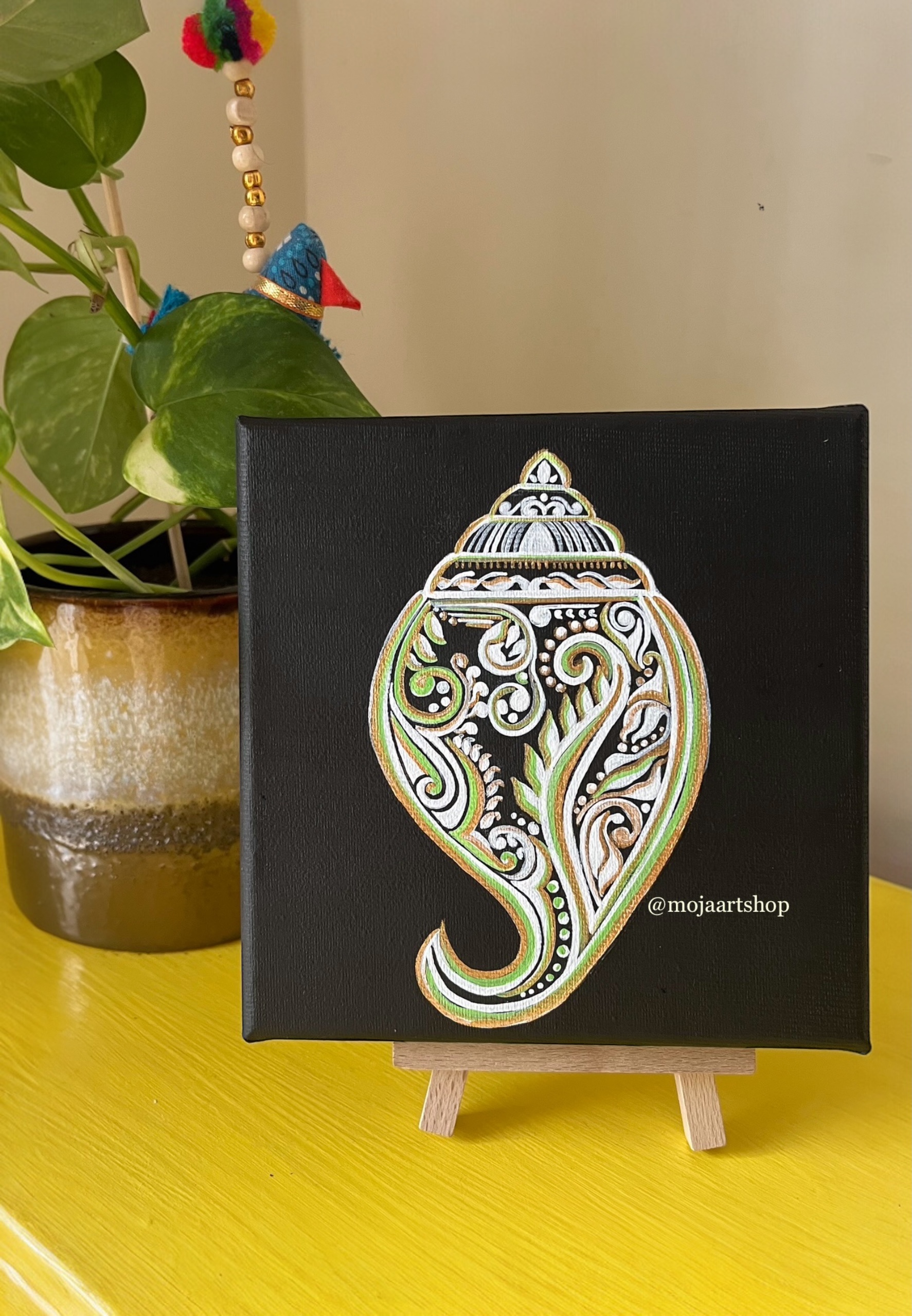 This painting is part of my Bangaliana series, a personal tribute to the rich cultural heritage of Bengal. Its style and motifs are inspired by the traditional Aplona art form, with delicate patterns and folk aesthetics that capture the timeless charm and spiritual essence of Bengali rituals.