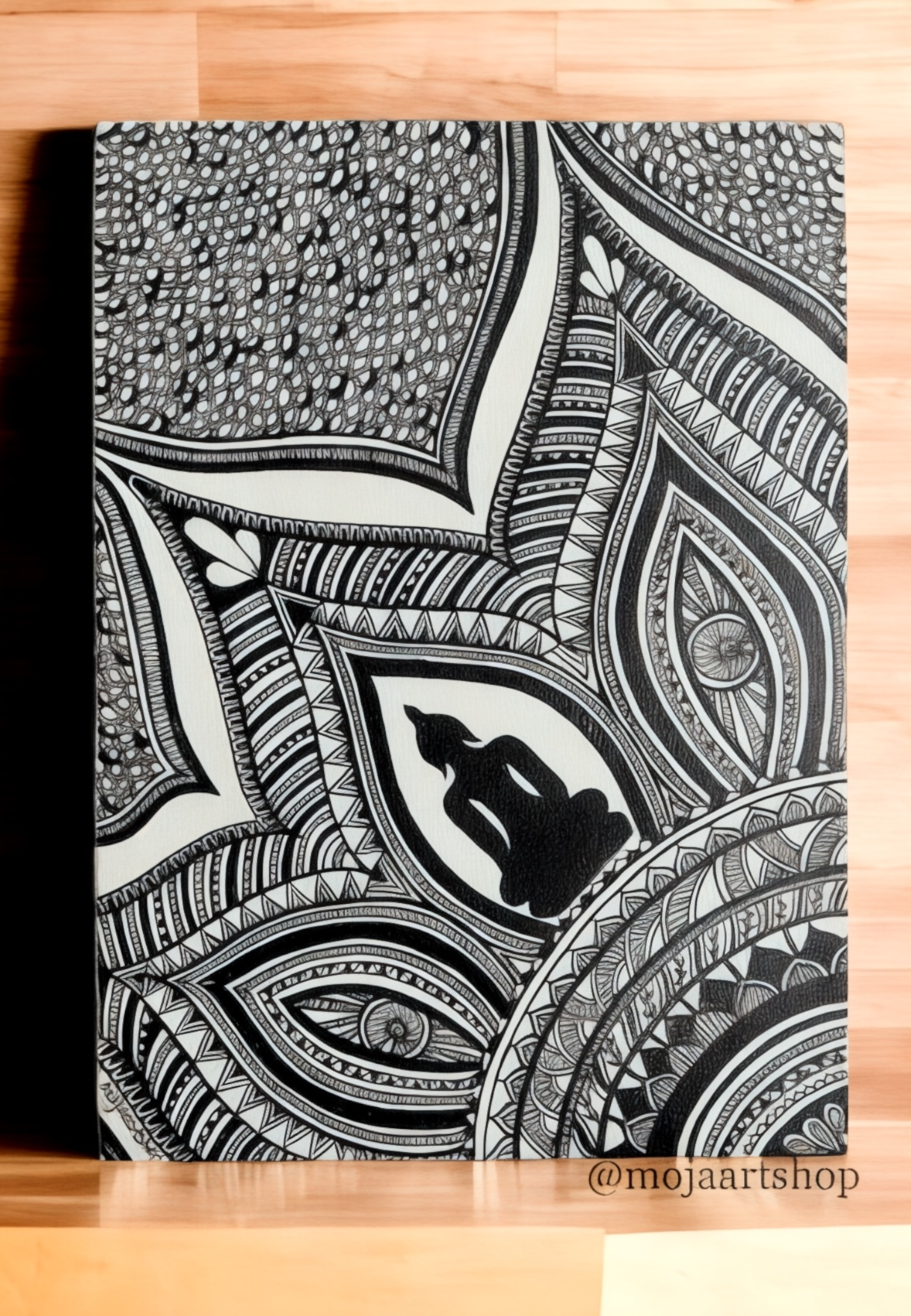 This painting of Lord Buddha reflects timeless wisdom, inner balance, and spiritual harmony. Created during a period of transition, it was painted soon after I moved to a new country, when I was searching for quiet amidst the chaos of change. Using black and white with thoughtful details, the painting allowed me to pause, experience mindfulness, and welcome the big change in my life. It serves as a reminder that peace can be found even in unfamiliar places. Ideal for a meditation corner or living space, this painting adds meaning beyond décor, offering a sense of grounding, clarity, and comfort during life’s shifting moments.